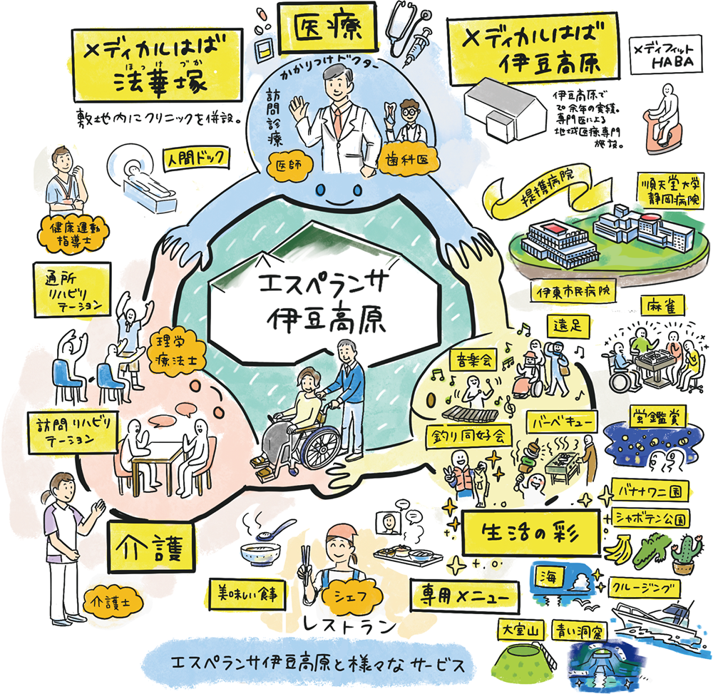 今回、開設したメディケアサポートHABA エスペランサ伊豆高原は、自然溢れるこの地域の住み慣れた場所で、又は都会で暮らしている方々がセカンドライフとして自然を求め、自らが参加しながら目的を持った楽しく活き活きとした生活ができる環境を提供することを理念としています。 医療・介護・予防の三位一体のサービスを通して他にはない「新しい老人ホームのカタチ」を和製CCRC(Continuing Care Retirement Community)として提案していきます。